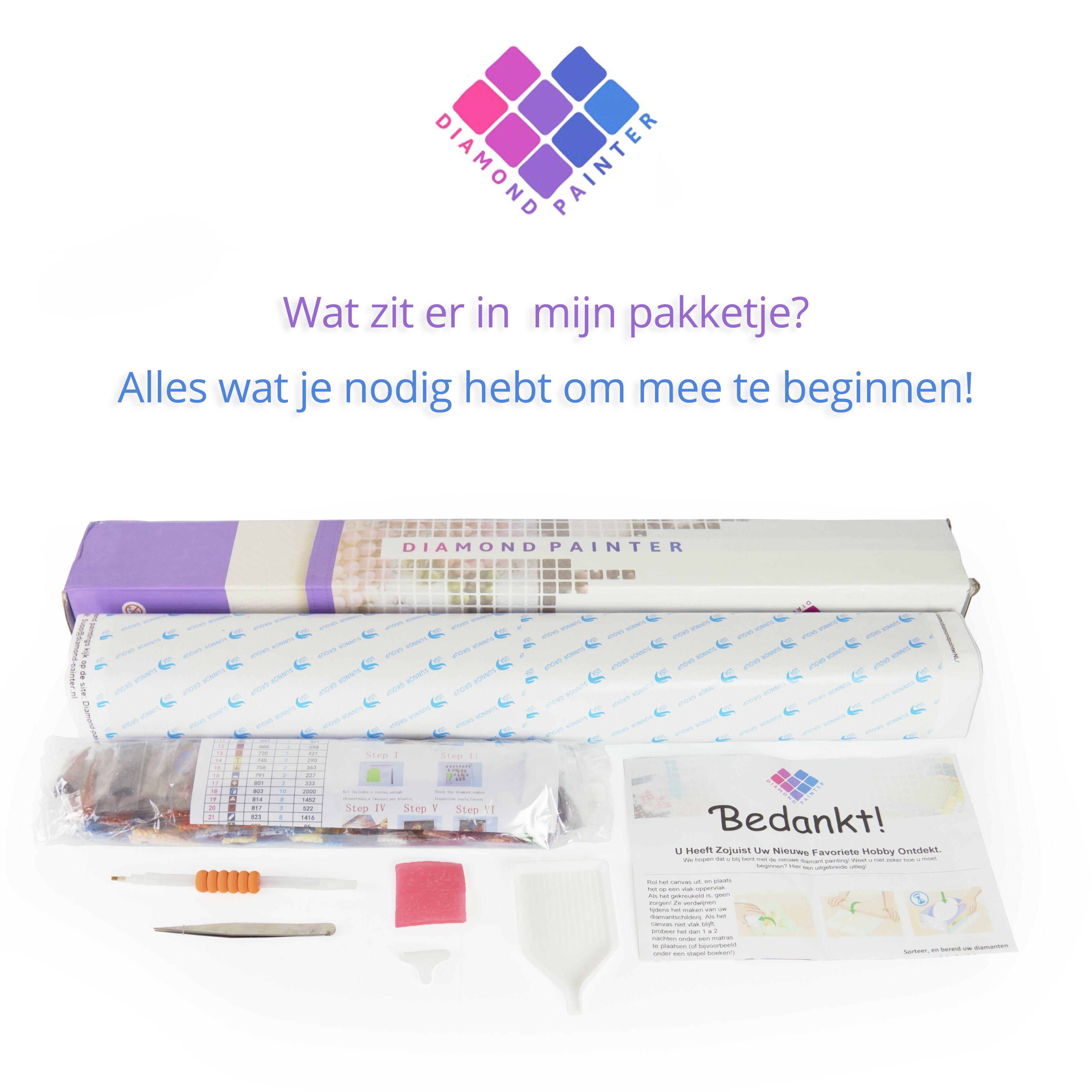 In de diamond painting pakketten zit alles wat je nodig hebt om meteen te beginnen